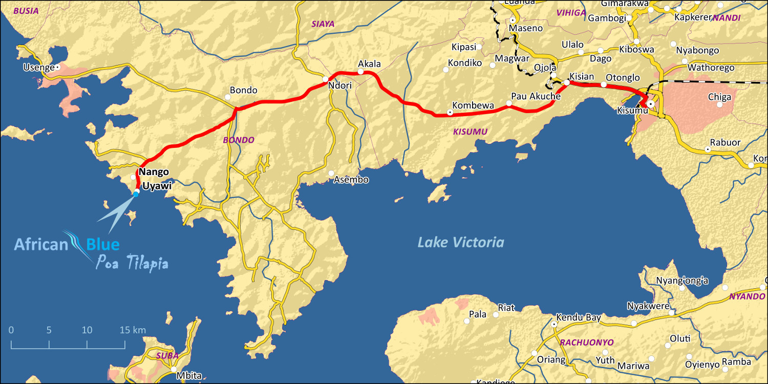 African Blue Limited is producing very fresh and high quality tilapia in cages in the clear and pristine waters of Lake Victoria. We are located next to Uyawi Beach in Siaya County, Western Kenya, 15 km south of Bondo (for details see the map below).